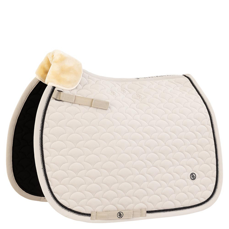 Virkelig smukt og stilfuldt velourunderlag med underside i fugtregulerende materiale, som hjælper til at holde hesten tør under ridning. Flot pipe og sten hele vejen rundt samt aftageligt faux fur ved manken, som sikrer høj komfort for hesten. De små sili…